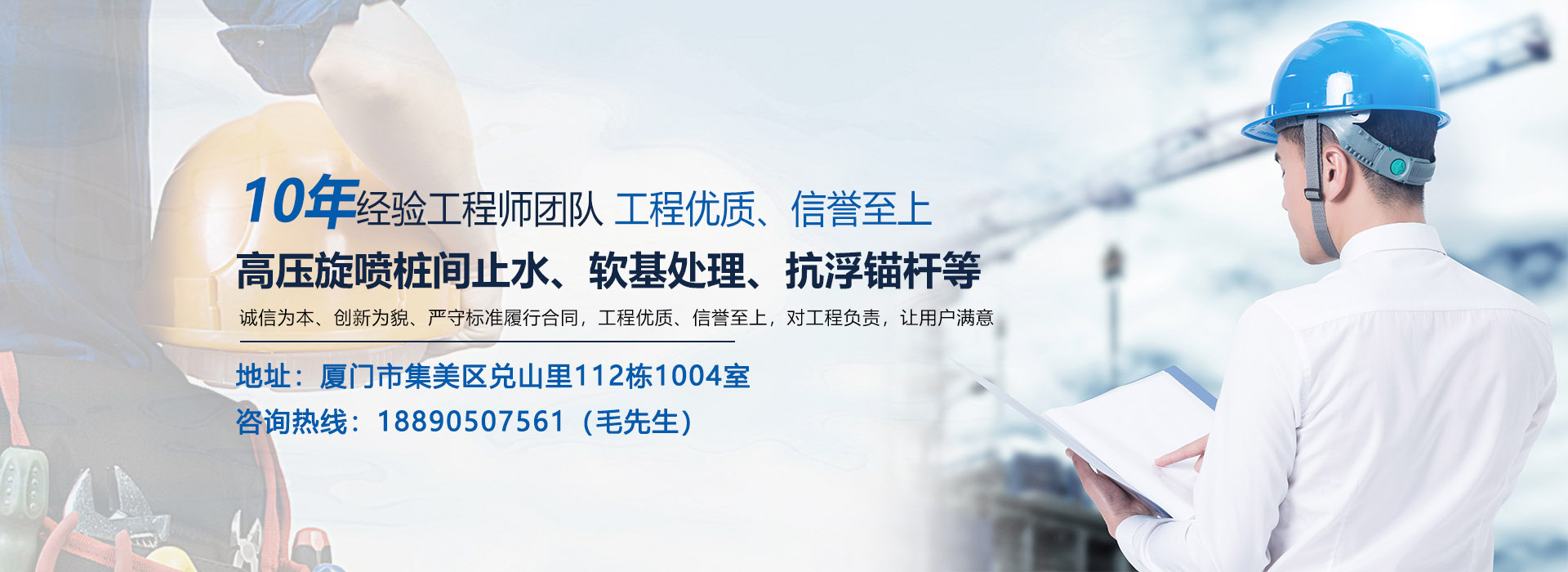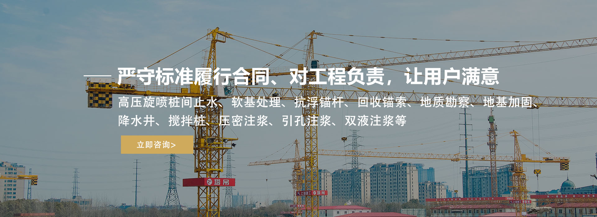 公司主營:高壓旋噴樁間止水、軟基處理、抗浮錨桿、回收錨索、地質(zhì)勘察、地基加固、降水井、攪拌樁、壓密注漿、引孔注漿、雙液注漿等,公司規(guī)模龐大,不斷超越、追求完美,誠信為本、創(chuàng)新為貌、嚴(yán)守標(biāo)準(zhǔn)履行合同,工程優(yōu)質(zhì)、信譽(yù)至上,對工程負(fù)責(zé),讓用戶滿意。